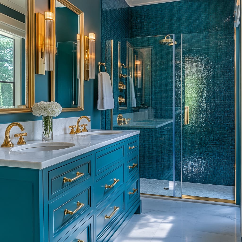 For a bold and modern bathroom, consider installing light blue fixtures like faucets, showerheads, or even towel bars. While less common than chrome or brushed nickel, blue-toned fixtures bring an artistic and unexpected flair.