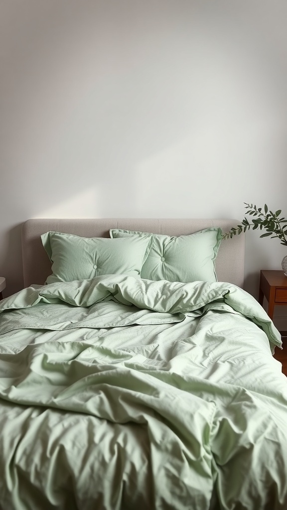 Sage green bedding creates a soothing atmosphere in any bedroom. The soft, muted tone brings a sense of calm and tranquility. In the image, the light sage green duvet and pillows invite you to relax and unwind.