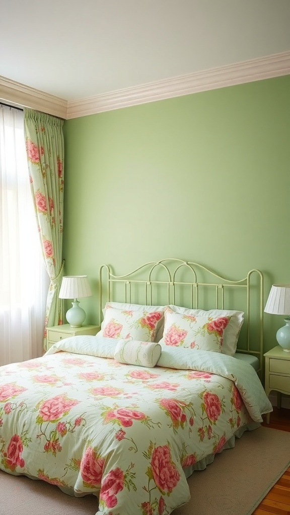 The image showcases a lovely sage green bedroom, where the walls are painted in a gentle green hue. The bedding features a floral design with pink roses that pop against the soft background. This combination brings a sense of nature indoors, making the space feel lively yet relaxing.