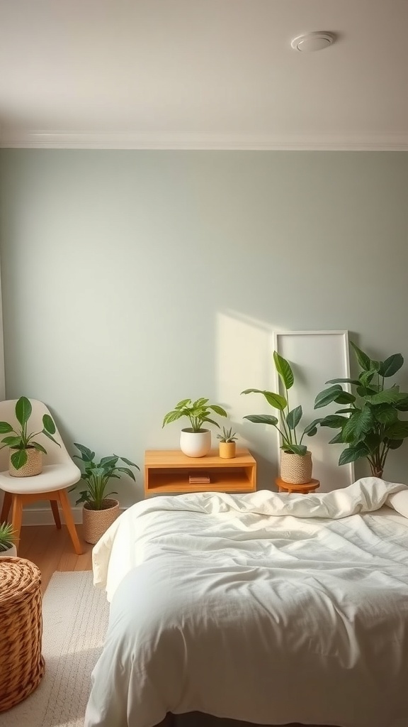 The room features a cozy bed with a simple white duvet, inviting you to unwind. Surrounding the bed are various plants, adding a touch of nature that promotes a fresh and airy feel. The greenery not only brightens the space but also contributes to better air quality, making it a healthier environment.