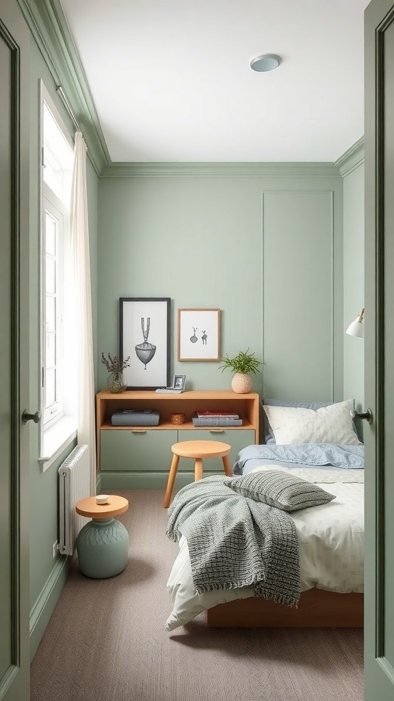 Sage green is a fantastic choice for small bedrooms. This soft, muted color creates a calming atmosphere, making the space feel larger and more open. In the image, you can see how the light sage green walls blend beautifully with the natural light coming in from the window. This combination brightens the room and adds a refreshing touch.