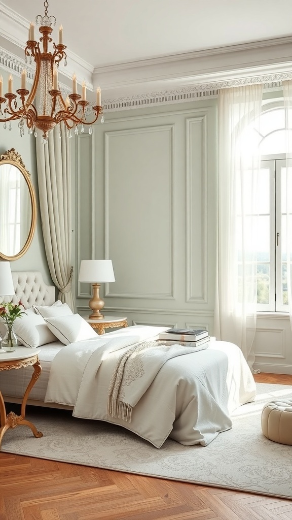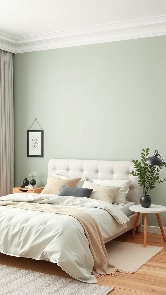 The image showcases a beautiful bedroom featuring light sage green walls paired with white furnishings. This combination creates a fresh and inviting atmosphere. The soft green hue adds a touch of nature, while the white elements keep the space feeling airy and bright.