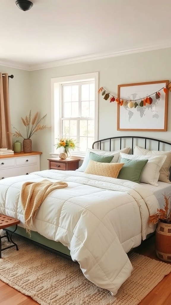 Light sage green bedrooms offer a calm and refreshing vibe, making them perfect for seasonal decor. This color pairs beautifully with various seasonal themes, allowing you to switch things up throughout the year.