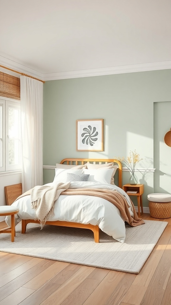 Natural elements, like the wooden nightstand and decorative basket, enhance the serene feel. A simple piece of artwork on the wall adds a bit of personality without overwhelming the room. This setup showcases how light sage green can transform a bedroom into a tranquil retreat.