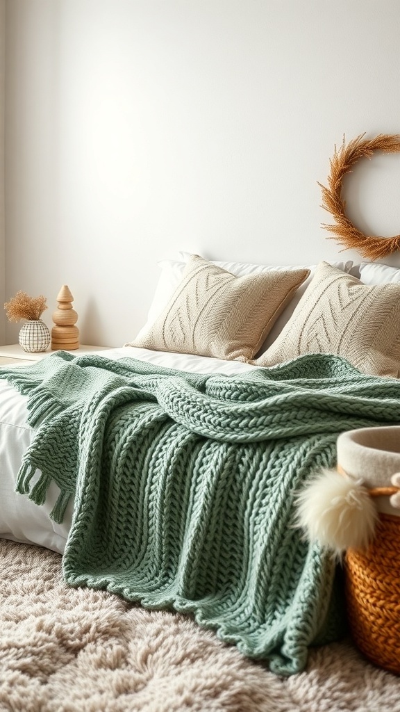 Creating a cozy bedroom is all about layering textures. In the image, the light sage green blanket adds a soft touch to the bed, inviting you to snuggle in. The chunky knit pattern not only looks stylish but also feels warm and comforting.