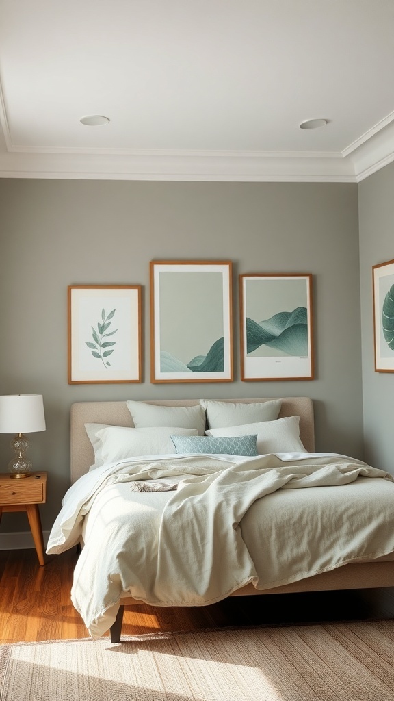 Artistic decor plays a big role in bringing personality to a sage green room. The framed artwork above the bed adds a touch of sophistication. The botanical prints echo the green tones, creating a cohesive look. Choosing art that reflects nature can enhance the serene vibe of the room.