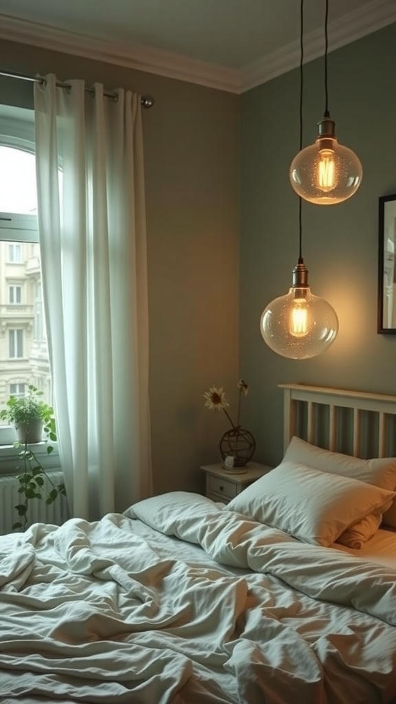 Sage green lighting fixtures can really tie a room together. In this cozy bedroom, the soft glow from the hanging bulbs complements the light sage green walls beautifully. The warm light creates a welcoming atmosphere, perfect for winding down after a long day.