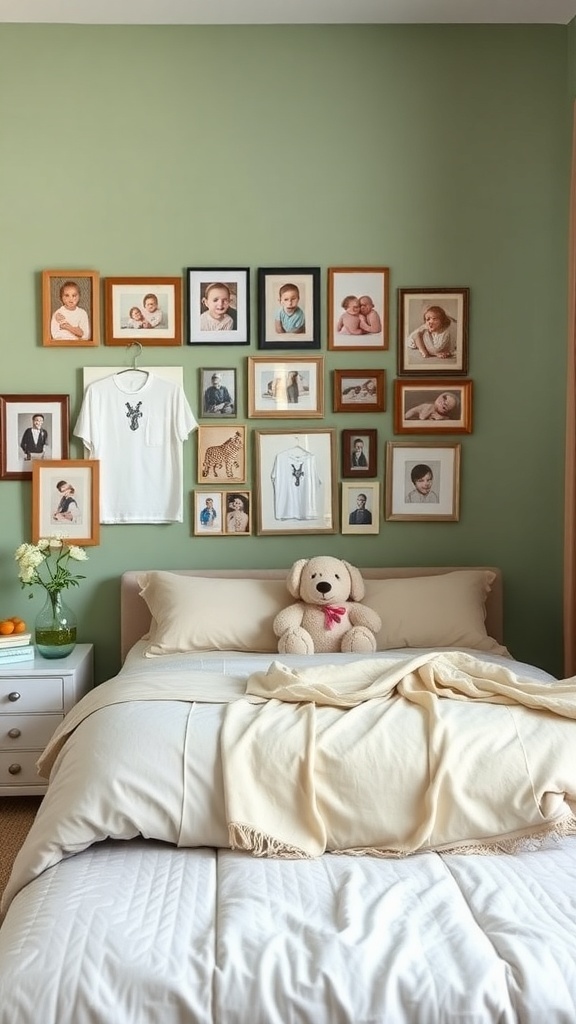 Your sage green bedroom can be a cozy retreat filled with personal touches. The soft green walls create a calming backdrop, perfect for showcasing your favorite memories. A gallery wall of framed photos adds warmth and character, making the space uniquely yours.