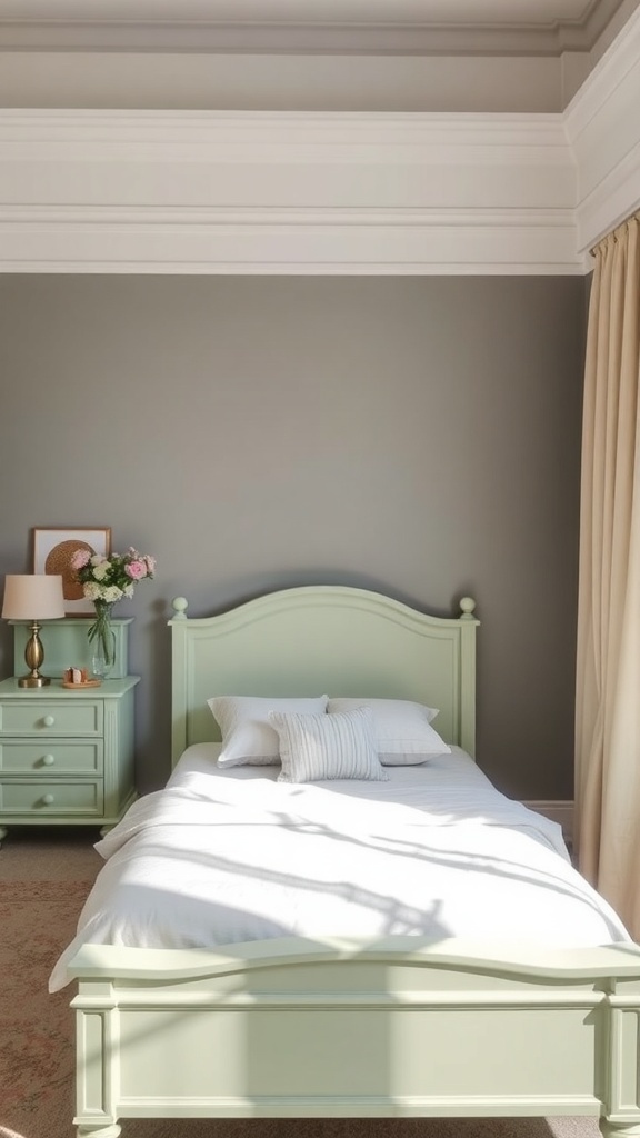 Sage green furniture can bring a fresh and calming vibe to your bedroom. The light sage green bed frame and nightstand in the image create a soft, inviting atmosphere. This color pairs well with neutral walls, allowing the furniture to stand out without overwhelming the space.