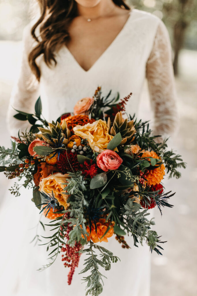 Whether you’re envisioning a classic, romantic bouquet with roses and peonies, or a more whimsical arrangement with sunflowers and daisies, there’s a fall wedding bouquet for every bride. Take inspiration from nature’s beauty—rich reds, oranges, yellows, and deep purples—and let your bouquet tie together your wedding’s overall aesthetic.